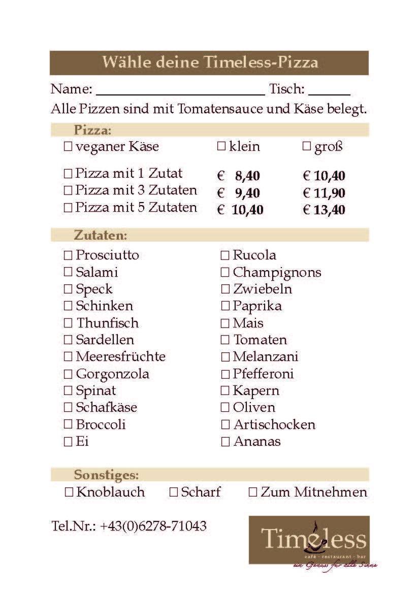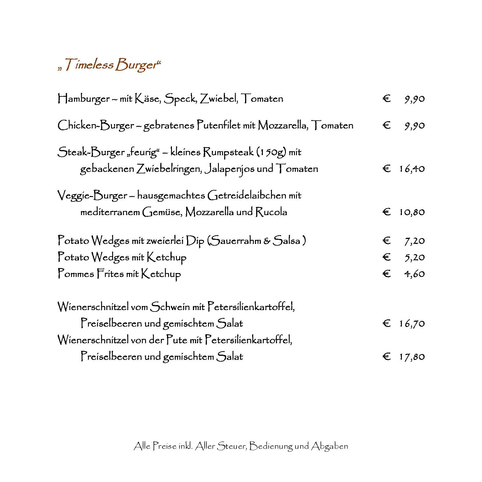 Herzlich Willkommen! Essen, trinken, plaudern und ein bisschen freie Zeit genießen… „Ein Genuss für alle Sinne“ ist für uns nicht nur ein Slogan, sondern eine Philosophie, die wir leben und unsere Gäste bei uns spüren sollen. Das Timeless, als Cafe, Restaurant und Bar, bietet genau das. In gemütlicher Atmosphäre treffen sich Jung und Junggebliebene. Wir bieten neben gediegenem Ambiente eine große Auswahl an Produkten, wie hausgemachtes Speiseeis, Torten, Nudeln oder für den großen Hunger auch ein herzhaftes Steak.
